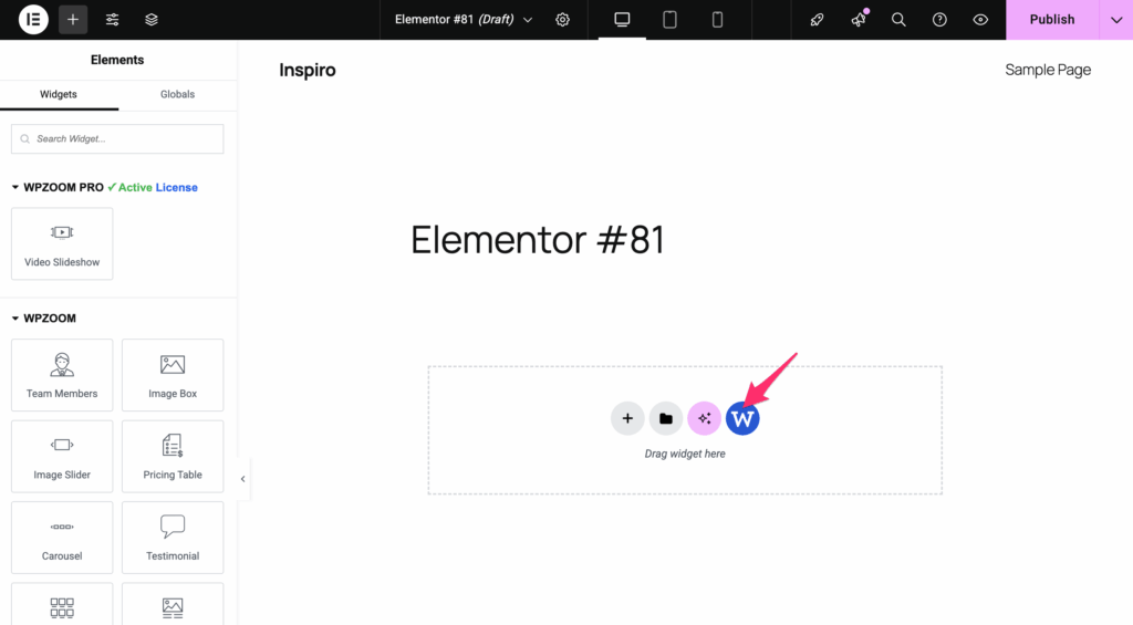Click on the blue W icon (WPZOOM Library) in Elementor to load one of the pre-built Inspiro templates.